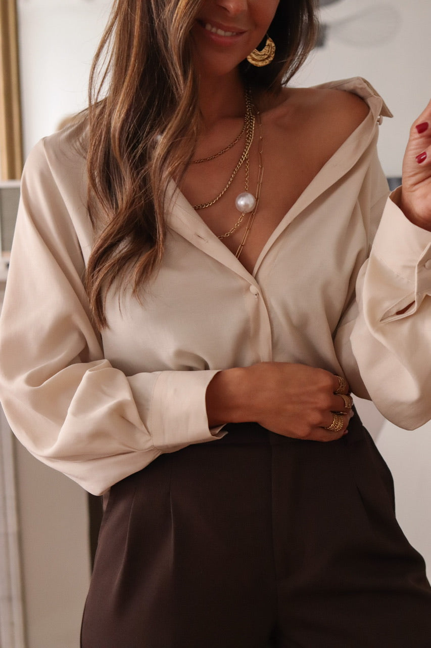 • Chemises boutonnées : Dotées d’un col soigné et d’une patte de boutonnage parfois cachée, ces chemises incarnent l’élégance formelle. Elles se portent avec un pantalon droit ou une jupe crayon pour un rendu professionnel.